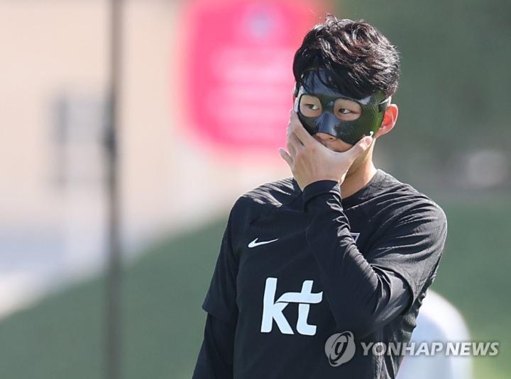 [图]2022年11月17日,韩国队长孙兴慜在多哈的Al Egla训练基地内佩戴防护面罩进行训练