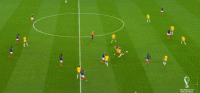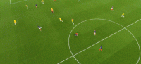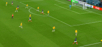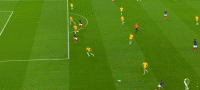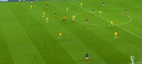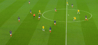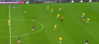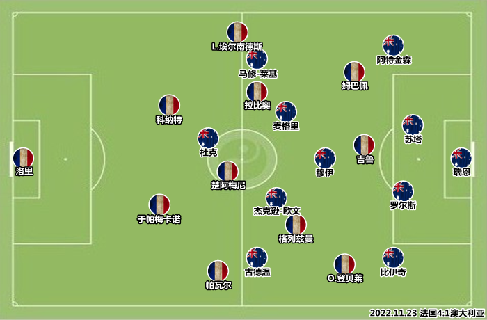 两名边后卫助攻力度有限,格列兹曼离开了前腰位置,法国的进攻简化为两名边锋的个人突破,姆巴佩和奥斯曼-登贝莱陷入以寡敌众的境地。边路进攻打不开局面,两翼冲得过猛导致中场脱节,法国在前场边路丢球后很难组织就地围抢,对手可以轻松地获得长传发动进攻的机会。格列兹曼戍边是为了破坏对手的边路配合,但澳大利亚并不准备在边路集结兵力,由穆伊控制机节奏,通过长传为边锋制造一对一机会才是他们的目标。