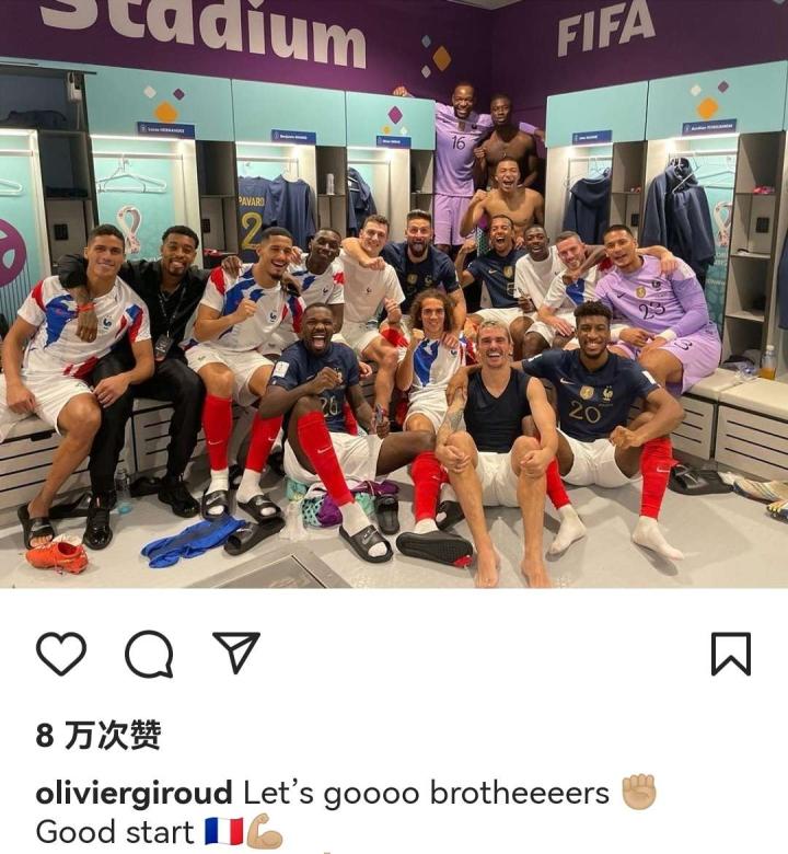 吉鲁社媒晒法国队在更衣室庆祝胜利的合影:“让我们继续加油,兄弟们!一个好的开始!”