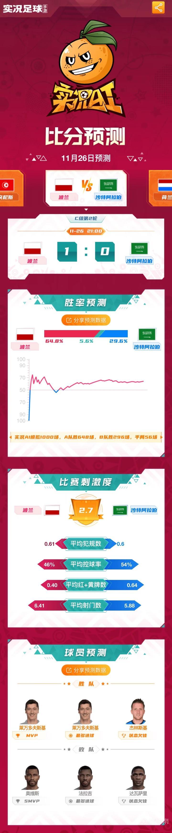 虽然沙特队在首轮爆冷击败了夺冠热门阿根廷队,但实况AI不认为他们还能继续创造奇迹,实况AI预测本场比赛莱万会有出色的表现,并且能率领波兰队1-0击败沙特队。