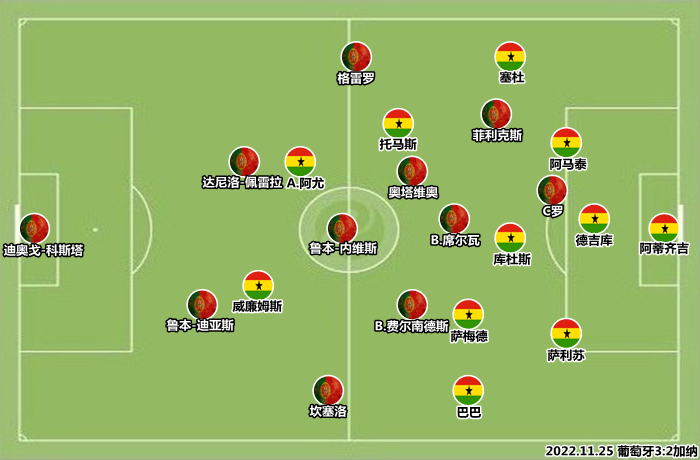 令人稍感意外的是,费尔南多-桑托斯既没有选择风格强硬的抢断高手帕利尼亚,也未能重用回归葡超后表现不俗的若昂-马里奥,而是将鲁本-内维斯摆在其不擅长的单后腰位置上。加纳的阵型为352/532,边翼卫对位葡萄牙边卫,中路有足够的兵力对控球矩阵进行绞杀。两翼缺少速度型球员制造纵深,中路只有老将C罗能够提供一些对抗,菲利克斯等人体格劣势会在狭小的空间内被放大。