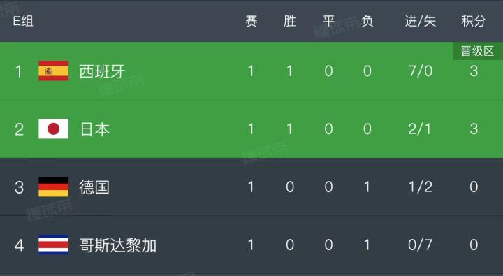 西班牙7-0狂胜很有可能拿下一个出线名额;日本2-1逆转德国,若下场比赛拿下最弱的哥斯达黎加,那么德国战车可能会再次遭遇小组出局的厄运。