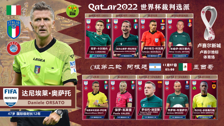 此外,揭幕战主裁达尼埃莱·奥萨托以及巴西裁判员威尔顿·桑帕约将成为本届裁判中首先完成小组赛执法“梅开二度”的两位。奥萨托执法揭幕战时发挥相当出色,本轮将要执法的阿根廷与墨西哥一役对其仍然是次大考验;相比之下,桑帕约的首场执法(荷兰2:0)塞内加尔则显得难度不大,他即将面对的波兰与沙特的大战同样重要。