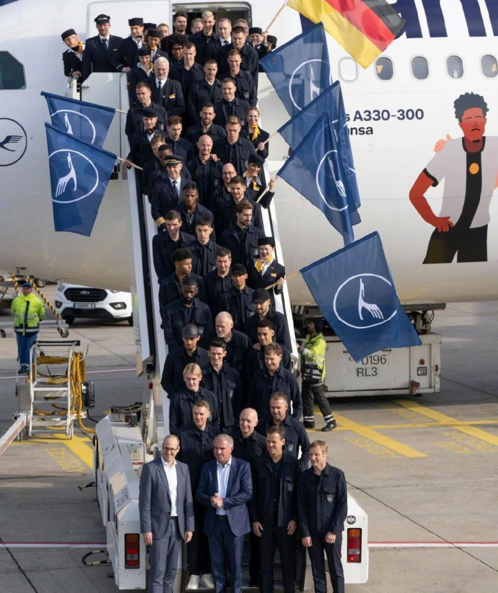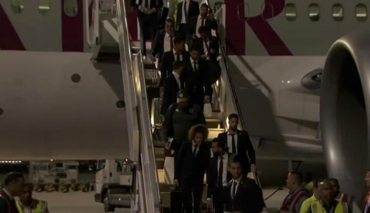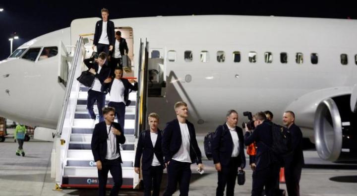 球员们都身穿由阿迪达斯赞助的蓝色运动服,在下机过程中球员们都十分严肃,可见他们对这届世界杯的重视程度。