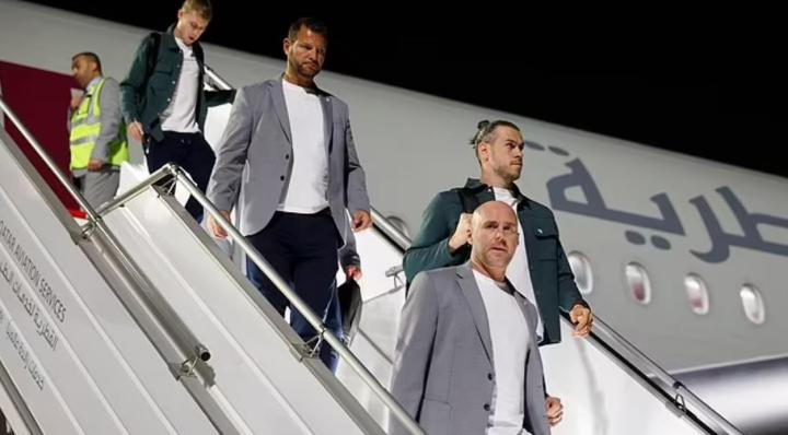 本次抵达多哈,威尔士球员都身着深绿色夹克,里面穿着白色内搭;教练组则身穿灰色西装白色内搭。威尔士的当家球星自然是“大圣”贝尔,贝尔仍然保持着他的经典发型,将头发全都绑了起来。
