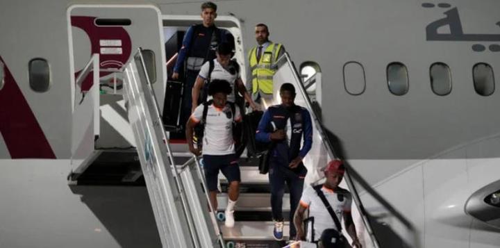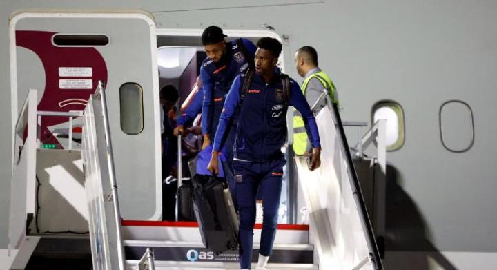 厄瓜多尔球员们在抵达卡塔尔多哈后,全都身着国家队球衣或运动外套,在下机的过程中一直非常开心,互相开着玩笑。