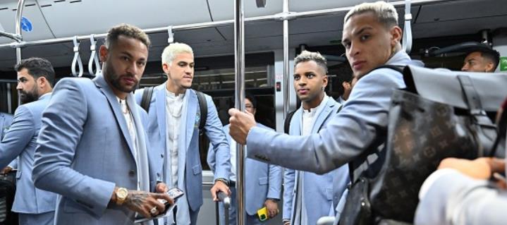 世界排名第一的巴西队是本届世界杯最后一支抵达卡塔尔的球队。在抵达照中,巴西球员们身穿浅蓝色西装,白色T恤,风格清新脱俗,显得球员们很有活力。