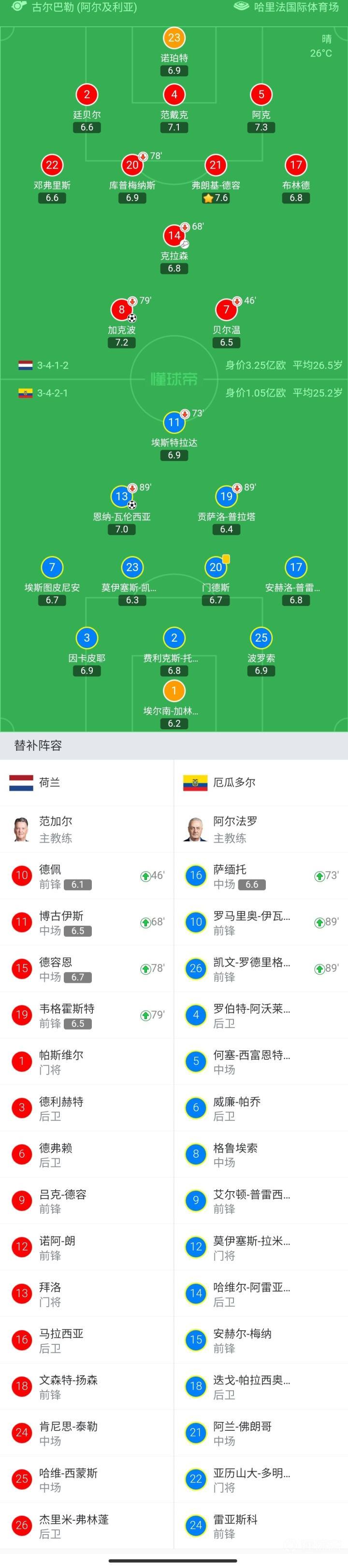 荷兰首发:23-诺珀特、2-廷贝尔、4-范戴克、5-阿克、17-布林德、21-弗朗基-德容、20-库普梅纳斯(78′15-德容恩)、22-邓弗里斯、14-克拉森(68′11-博古伊斯)、7-贝尔温(46′10-德佩)、8-加克波(79′19-韦格霍斯特)
