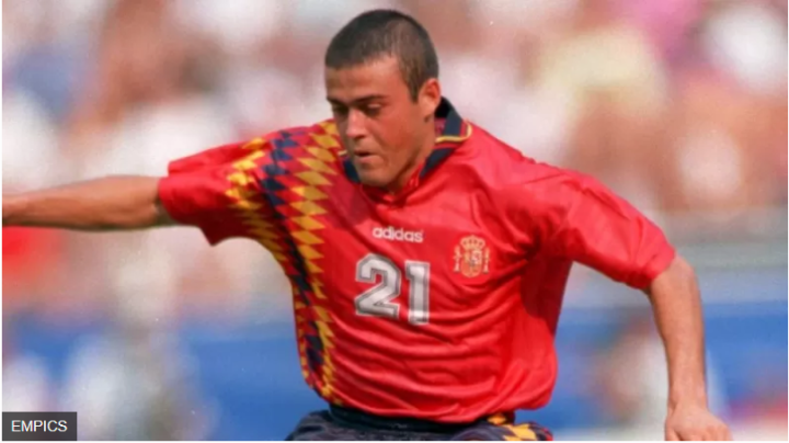(图)现任西班牙主教练路易斯·恩里克在1994年世界杯上身着西班牙的主场球衣