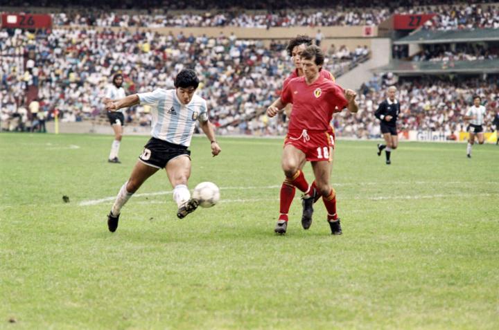 (图)马拉多纳在1986年世界杯阿根廷对阵比利时的半决赛中。