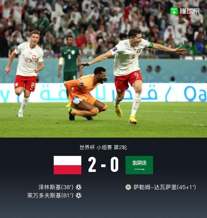 第82分钟,沙特后场玩火,阿卜杜勒拉赫-马尔基出现低级失误,莱万多夫斯基伺机而动抢断后单刀推射破门,斩获个人世界杯首粒进球泪洒赛场,国家队生涯进球数来到77球,追平贝利跻身历史前十!波兰2-0锁定胜局!