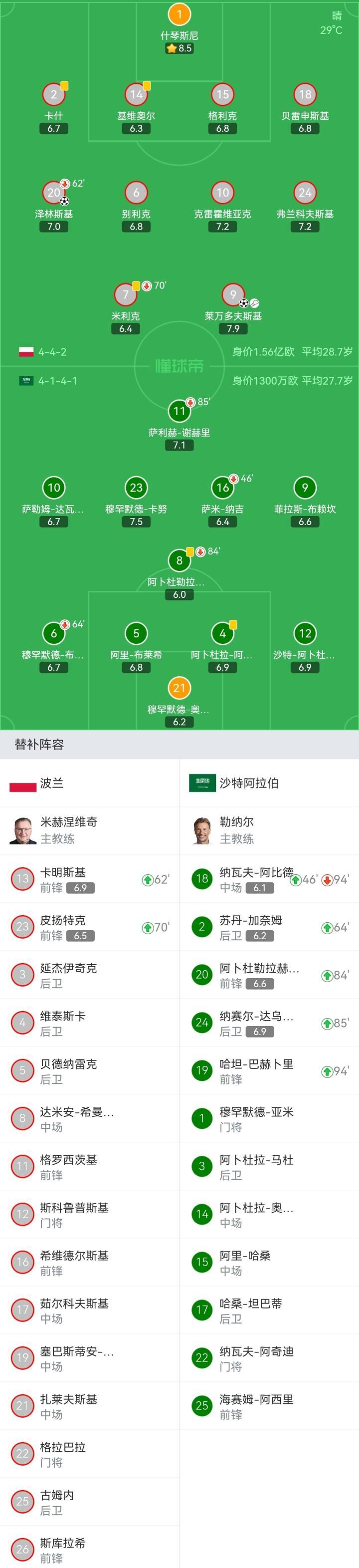 波兰首发:1-什琴斯尼、18-贝雷申斯基、15-格利克、14-基维奥尔、2-卡什、10-克雷霍维亚克、6-别利克、20-泽林斯基(62'13-卡明斯基)、24-弗兰科夫斯基、7-米利克(70'23-皮扬特克)、9-莱万多夫斯基