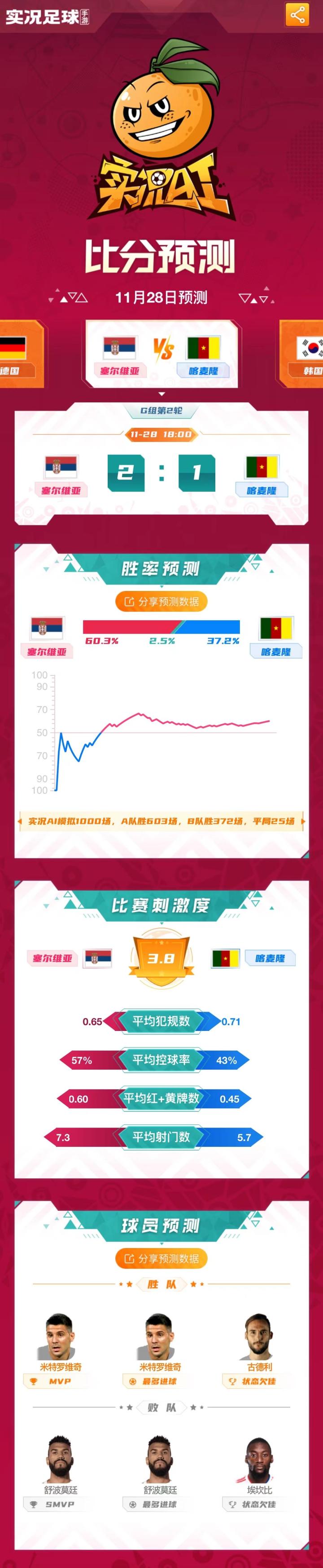 本场比赛实况AI还是更看好欧洲劲旅塞尔维亚,相信塞尔维亚可以击败喀麦隆,比分为2-1。实况AI君认为这场比赛是英超神锋米特罗维奇和德甲神锋舒波-莫廷的正面对决,两个人都能有所建树。