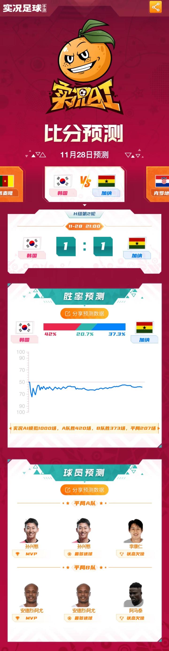 实况AI认为本场比赛是一场势均力敌的较量,韩国队将会和加纳队1-1战平,如此一来太极虎将会迎来两连平,而加纳队将会拿到本届世界杯的首个积分。实况AI预测两队头号球星孙兴慜和安德烈-阿尤都将会有出色表现。