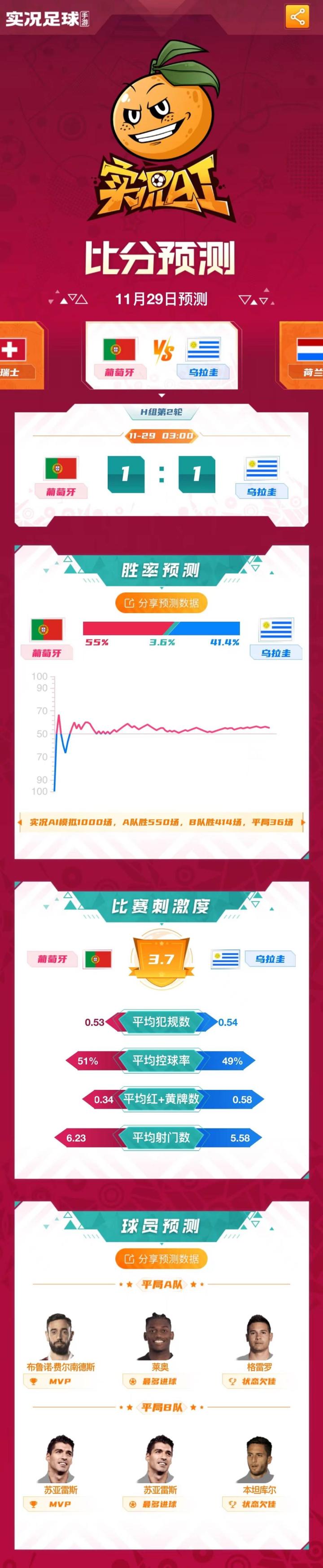 焦点战当然要足够胶着!实况AI认为葡萄牙和乌拉圭的比赛将会1-1战成平局,就连控球率、犯规数、射门数等数据也基本是平分秋色。此外实况AI表示本场比赛的关键球员并不是C罗,而是B费和苏亚雷斯。
