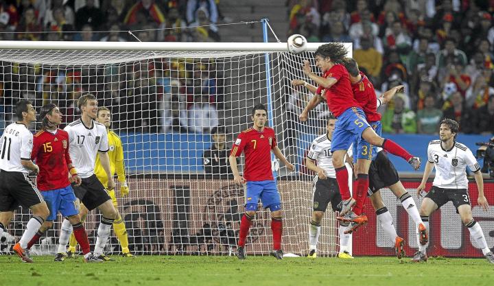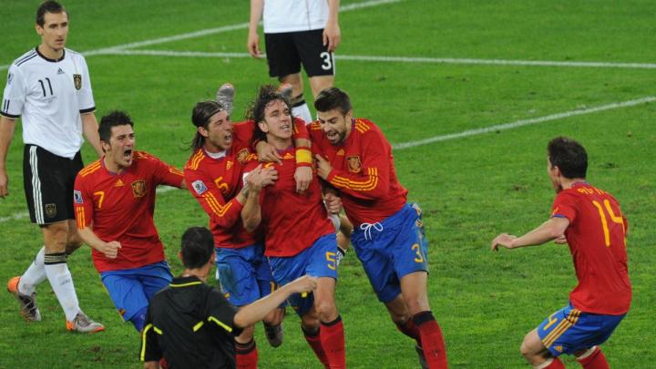 2010年南非世界杯,西班牙与德国于半决赛再度相遇,而这一次则是彼时如日中天的红色斗牛士与他们美丽的Tiki-Taka笑到了最后。西班牙前场一众小快灵球员眼花缭乱的穿插跑动之下,德国队此时则显得有些缓慢而笨重,最终凭借普约尔的头球破门,西班牙1-0取胜,历史上第一次在世界杯赛场上战胜德国,也在那一年捧起了他们梦寐以求的大力神杯。