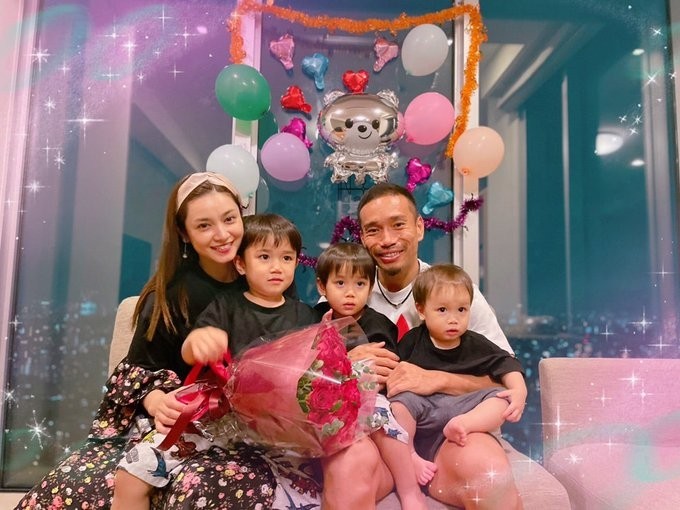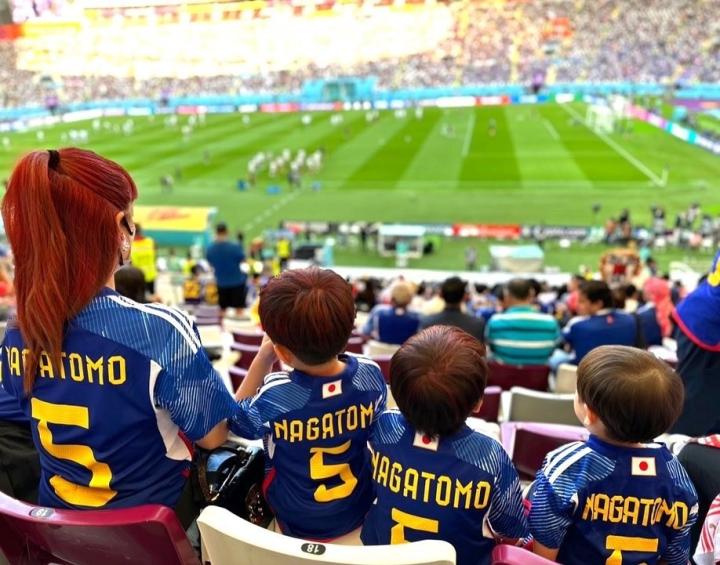 平爱梨在个人社交媒体晒出了日本首战对阵德国的现场照片,她和孩子们都穿着长友佑都的5号球衣,有趣的是,平爱梨和两个孩子都染了红发,和长友佑都保持一致。