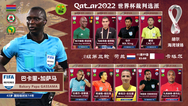 第三轮A组的两场比赛则分别由加萨马和蒂尔潘执法。这是冈比亚裁判加萨马参加的第三届世界杯,他在2014和2018世界杯上分别执法了一场小组赛,荷兰与卡塔尔的较量应该也是其本届赛事唯一一次主裁任务安排。三届世界杯,三场小组赛,非洲传奇加萨马即将完成他的最后一次世界杯之旅。