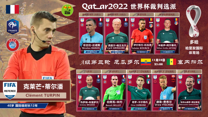 国际足联委派法国名哨克莱芒·蒂尔潘执法厄瓜多尔与塞内加尔的A组出线生死战,足以看出对这场比赛的重视程度。蒂尔潘曾先后于2021和2022年执法欧联、欧冠决赛,并在本届世界杯小组赛第一轮执法了乌拉圭与韩国的较量。