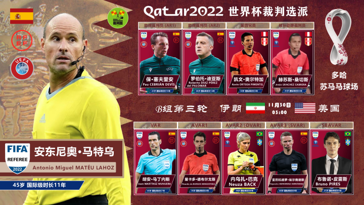 裁判圈据国际足联官方消息,北京时间11月30日凌晨三点,万众瞩目的“伊美之战”将由西班牙名哨——“小公举”安东尼奥·马特乌执法,VAR团队则由西甲裁判胡安·马丁内斯、里卡多·德布尔戈斯以及“埃尔南德斯平方”等人组成。