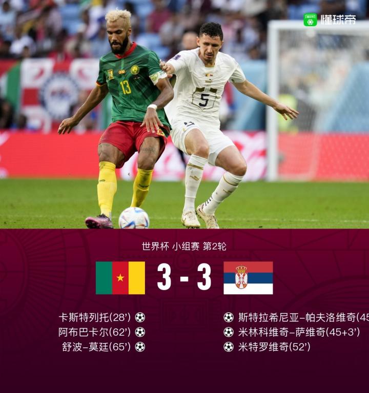 北京时间11月28日18:00,2022卡塔尔世界杯小组赛G组第2轮在贾努布球场展开争夺,喀麦隆对阵塞尔维亚,本场主裁判为哈桑,中国裁判马宁担任本场比赛的第四官员。上半场,米特罗维奇小角度兜射击中立柱后失良机,卡斯特列托角球进攻中埋伏后点推空门首开记录,斯特拉希尼亚-帕夫洛维奇与米林科维奇-萨维奇补时阶段接连破门助塞尔维亚瞬间逆转比分。下半场,米特罗维奇破门助球队扩大优势后屡失良机;随后场上风云突变,塞尔维亚后防突然“断电”,替补神兵阿布巴卡尔单刀挑射得手后又助攻舒波-莫廷破门,喀麦隆三分钟连入两球追平。最终,塞尔维亚痛失好局3-3战平喀麦隆。