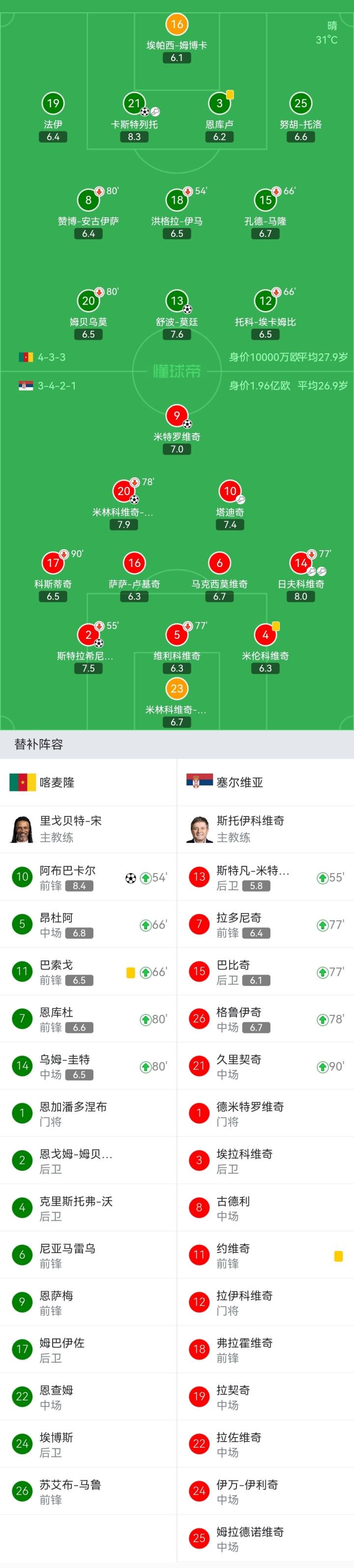 塞尔维亚首发:23-米林科维奇-萨维奇、2-斯特拉希尼亚-帕夫洛维奇(55'13-斯特凡-米特罗维奇)、5-维利科维奇(77'15-巴比奇)、4-米伦科维奇、17-科斯蒂奇(90+1'21-久里契奇)、6-马克西莫维奇、20-米林科维奇-萨维奇(77'26-格鲁伊奇)、16-萨萨-卢基奇、14-日夫科维奇(77'7-拉多尼奇)、10-塔迪奇、9-米特罗维奇