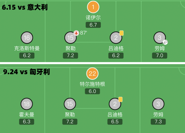 德国队首战日本的两粒失球分别是被对方利用了右后卫的身后以及左中卫的身后空间,本场比赛弗里克将这两个位置都进行了调整,吕迪格和聚勒搭档中卫,劳姆和蒂洛-科雷尔分居左右。在欧国联的比赛中聚勒和吕迪格的组合也是弗里克更加常用的选择。