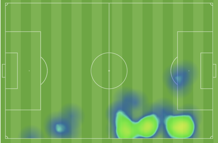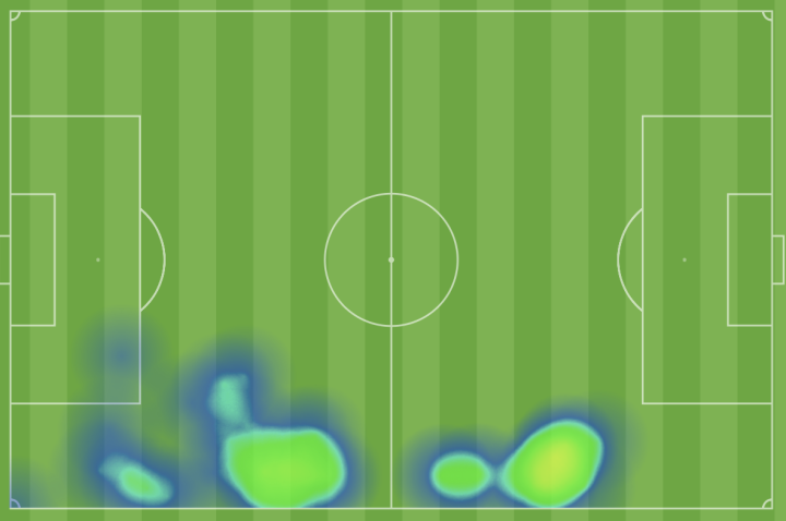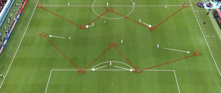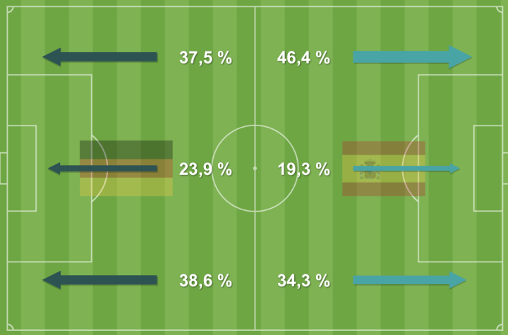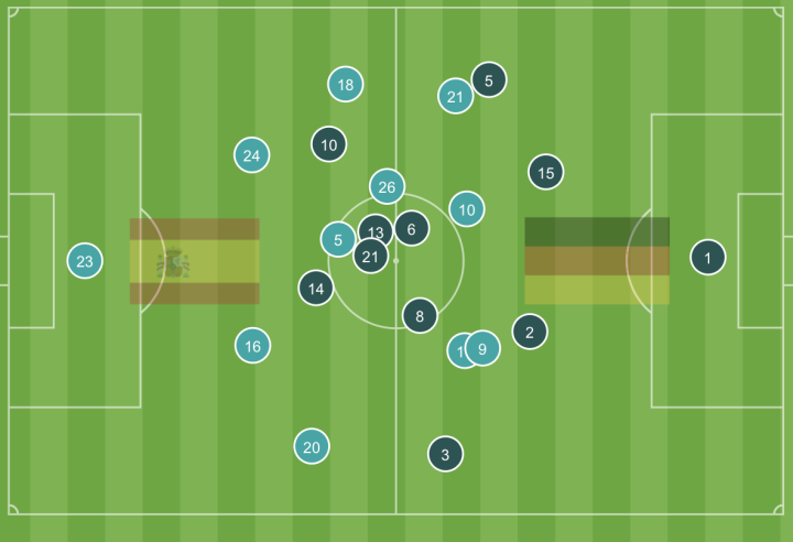 西班牙得到了控球权,在场上充分展现了球队的控球能力,进攻时教科书般的2-3-2-3站位,合理的利用场地宽度,但是与此同时他们没有利用好场地的纵深,左路奥尔莫对聚勒进行冲击也被后者用身体对抗的优势一一化解,即使是费兰-托雷斯换位到左路也没有在科雷尔和聚勒的防守下占到便宜。德国队充分发挥了他们在高位压迫上的特点,在进攻中也强调效率,用西班牙一半的控球时间完成了和对手差不多次数的进攻。不过怕先失球的弗里克上半场比赛并没有让双翼齐飞,边后卫一边上去了另一边马上就回去了,尤其是左侧劳姆对费兰-托雷斯预防性的提前盯人,这让他助攻的频率相较上一场大大减少。德国队首发的两名边后卫劳姆和科雷尔分别完成了全场最多的5次拦截和6次抢断。
