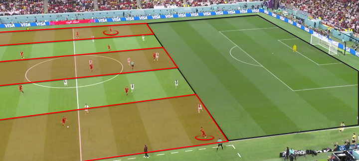 虽然恩里克在换人调整上占得先机,莫拉塔、尼科-威廉斯、科克的登场能保持住在他们相应区域的逼抢,但是其他球员体能的下滑已经很难保持住高位逼抢的强度,尤其是西班牙的左路,萨内的登场加上穆西亚拉的位置调整让西班牙的左路防守频频吃紧。