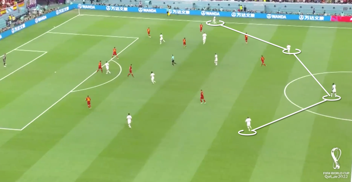 下半场恩里克率先变化,加强了对德国队纵深的打击,阿森西奥减少回撤更多的进行前插,他更多的来到左路和奥尔莫以及阿尔巴一起利用人数优势意图强攻,左路强攻中路和右路的队友包抄,这也是德国队第一场比赛被日本队利用过的一个点。