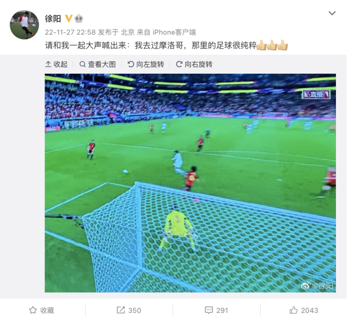在那场比赛之后,徐阳继续点评这个北非国家:“摩洛哥虽踢的足够漂亮,但却并不足以取得胜利,这也和摩洛哥百姓对足球的认知有着直接关系,他们更喜欢纯粹的足球,更喜欢展示自己的马赛回旋。不过世界杯的对手不会给你回旋的余地......另外,我确实去过摩洛哥。”