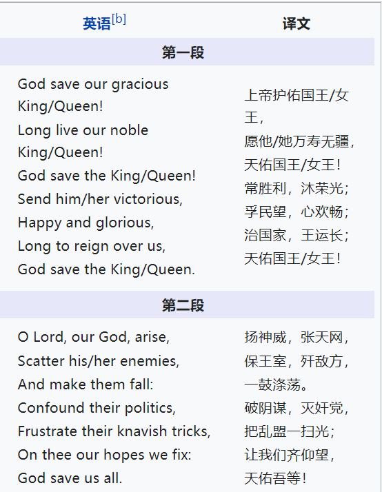 此后,英国国歌就有两个版本《God save the King/the queen》——天佑吾王。