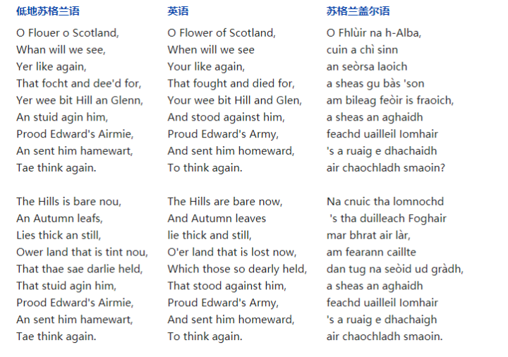 苏格兰现在使用的“国歌”是苏格兰之花。这首歌曲由罗伊·威廉森和他的组合The Corries创作,发表于1967年。