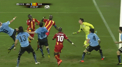 最后时刻,加纳队再次发起攻击,先是阿贝耶的射门被苏亚雷斯在门线用腿挡出,随后蒙塔里的强力头槌,越过门将穆斯莱拉,福西莱想要用头球或手都已来不及,此时只剩下孤独站在门线后的苏亚雷斯。