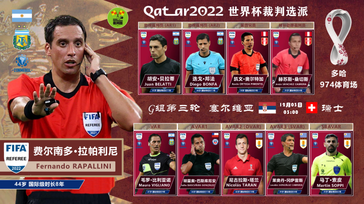 裁判圈今天凌晨,国际足联官方宣布,2022卡塔尔世界杯G组第三轮塞尔维亚与瑞士的较量,将由阿根廷裁判员费尔南多·拉帕利尼执裁,秘鲁的凯文·奥尔特加担任个人赛事的第8场四官,视频助理裁判员由阿根廷的毛罗·比利亚诺担任。