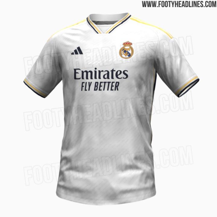 12月1日,足球装备网站Footy Headlines曝光了皇马23/24赛季主场球衣的谍照,这件球衣采用了白色主体外加黑&金线条描边的设计。