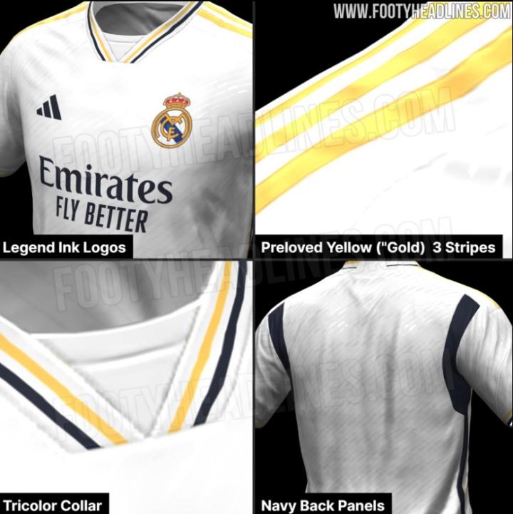 根据曝光的谍照,皇马23/24赛季的主场球衣将在袖口与领口处添加由黑、白、金三种颜色组成的细条纹装饰,肩部的阿迪经典三道杠则使用了亮金色作为搭配。