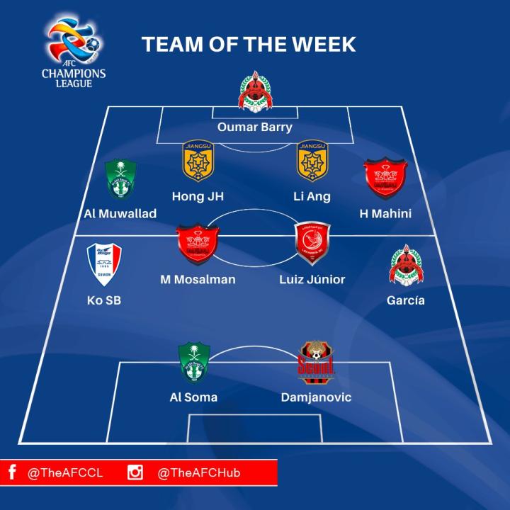 中场:穆萨尔曼(波斯波利斯)、路易斯-儒尼奥尔(莱赫维亚)、塞尔希奥-加西亚(赖扬)、高承范(水原三星)