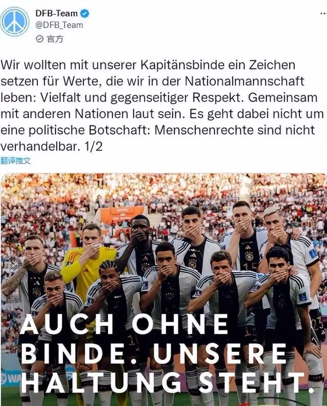 德国队官方声明写道:“我们想用我们的队长袖标来代表德国国家队的价值观:多样性和相互尊重……禁止我们的(彩虹)袖标等于剥夺我们的发言权。我们坚持立场。”