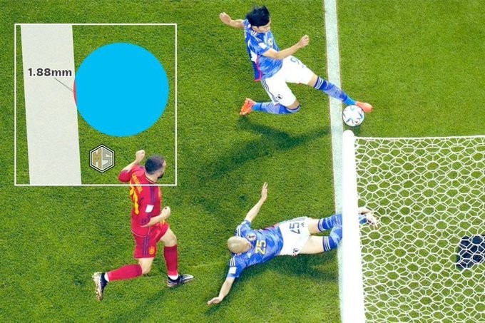 另外值得一提的是,凌晨的比赛结束,网上流传一个说法,说三笘薰传球的一瞬间皮球的垂直投影有1.88毫米还在底线内,这个说法属实吗?