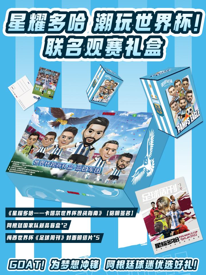 此外,由王牌化身X体坛周报X懂球帝联名打造的星耀多哈 潮玩世界杯!2022年卡塔尔世界杯观赛礼盒也正在商城售卖。世界杯联名观赛礼盒内含: