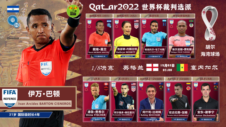 裁判圈昨天凌晨,国际足联官方公布了2022卡塔尔世界杯1/8决赛第3、第4场较量的裁判选派。其中,本届世界杯裁判界的“最大黑马”——萨尔瓦多人伊万·巴顿将执法英格兰与塞内加尔的对决。