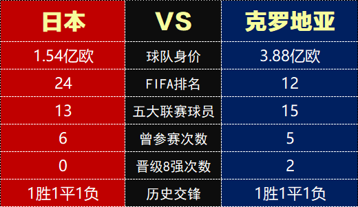 从实力上看,个人认为双方不分伯仲。后防线半斤八两,中场克罗地亚占优,锋线日本更胜一筹。从小组末轮的状态看,日本的士气更旺一些。但日本队有个特点,遇强不弱,遇弱不强。他们能战胜德国和西班牙,上届世界杯也差点把比利时拉下马。他们也能在预选赛输沙特,输阿曼,平越南,在小组赛输哥斯达黎加,就像在坐超级过山车。
