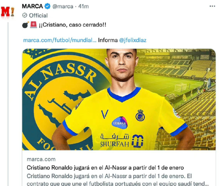 目前,C罗所在的葡萄牙还又比赛要打,他们的对手是瑞士,胜者进入8强。而就在这个备战的紧张时刻,关于C罗的下家消息突然被放出,令人颇感意外。据西班牙媒体《马卡报》的消息,C罗将会转战沙特阿拉伯的联赛,为利雅得胜利效力。