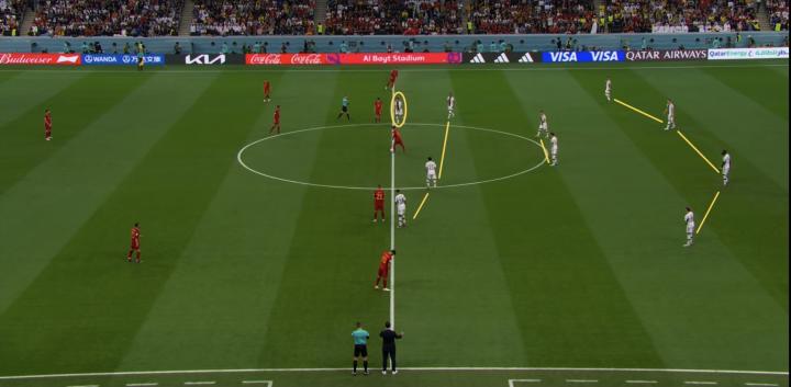 在中场,京多安、基米希、格雷兹卡三后腰第一次同时首发,就是要分别限制布斯克茨、佩德里和加维,同时,两个边前卫格纳布里和穆夏拉会向中路收缩,制造中场人数优势。穆勒负责切段两个中卫的联系,西班牙的进攻被迫向边路发展。如果边后卫向前传递,劳姆和科雷尔会贴身限制边锋接球。此时德国队的整体阵型已经向这一边靠拢,中场,边路球员将集体压迫西班牙的边路,进行最后的绞杀,这是德国夺回球权最好的时机。