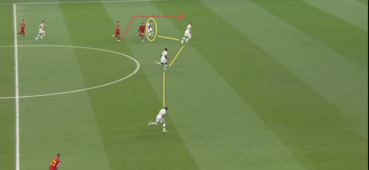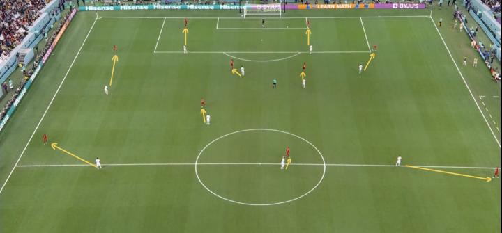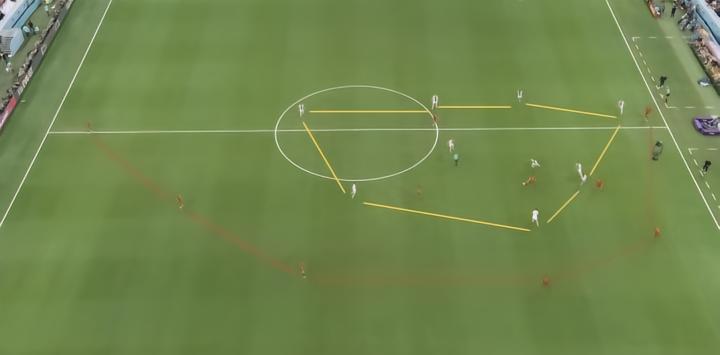 值得一提的是,为了限制西班牙的横向转移,德国队员平行移动时首先断的就是西班牙球员之间最直接的横向联系,使得其边路出球不得不做出更加危险的传球尝试(当然也可以安全回传)。