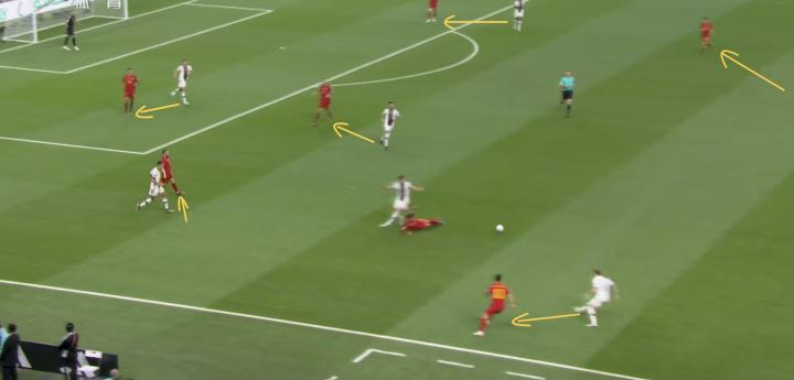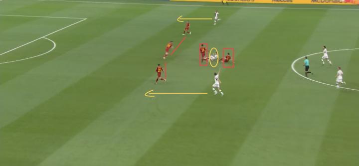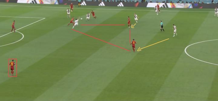 这种针对性的压迫创造出了几次球权转换,而且进行高位压迫不光是德国,西班牙有时候压迫得更深。
