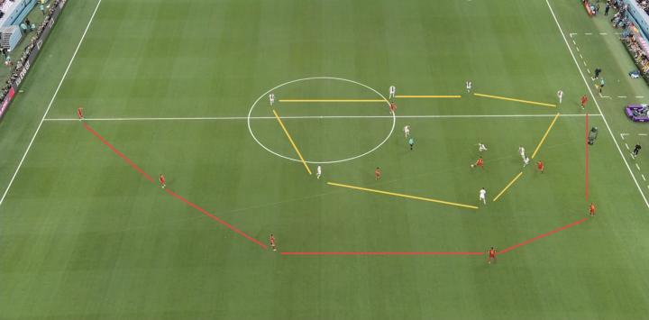 西班牙的控球阶段,其后卫线喜欢在高位参与进攻组织。而本场德国防守时的后卫线,并没有退回三区,而是处在中高位防守。所以比赛中经常可以看到两队球员在扁平的中场区域缠斗,人员十分密集,两队的后卫线有时甚至只相距30~40米。