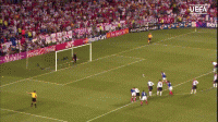 在中场未收到任何压迫的情况下,他突然头脑发热一个长传准备回传门将。结果这一记长传不但绵软无力,而且他也没看到狡猾的锋线杀手亨利正埋伏在禁区里,这记长传不偏不倚刚好极其舒服地传到了亨利的脚下,眼看就要形成单刀,门将詹姆斯不得已放倒了亨利,又是点球!只是这一次风水轮流转,变成了法国的点球。