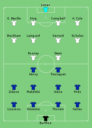 对阵法国他排出了斯科尔斯-杰拉德-兰帕德-贝克汉姆这样羡煞旁人的组合,虽然这里面有在之后被球迷们常年诟病的“双德共存问题”,但在这一届杯赛堪称是两人兼容的最好的一届。